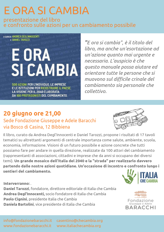 L’Italia che Cambia si ferma in Casentino! Quattro giorni di confronto tra i giornalisti che raccontano, mappano e mettono in rete l’Italia che è già cambiata. Un evento pubblico per presentare il libro “E ora si cambia – 500 azioni per gli individui, le imprese e le istituzioni che vogliono ricostruire il paese”. E un momento di incontro con le realtà del territorio. Giovedì 20 giugno presso la Sede della Fondazione Baracchi.
