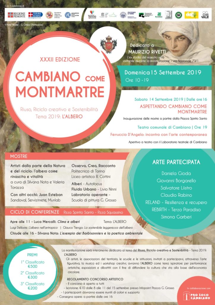 L’appuntamento, che proporrà performance artistiche, esposizioni e dibattiti, inizierà nel pomeriggio del 14 settembre, con la giornata di apertura intitolata Aspettando Cambiano come Montmartre, durante la quale verranno inaugurate le seguenti mostre: Artisti dalla parte della natura e del Riciclo: l’albero come rinascita e vitalità, a cura di Silvana Nota e Valeria Torazza; gli esiti del workshop Osservo, Creo e Racconto.