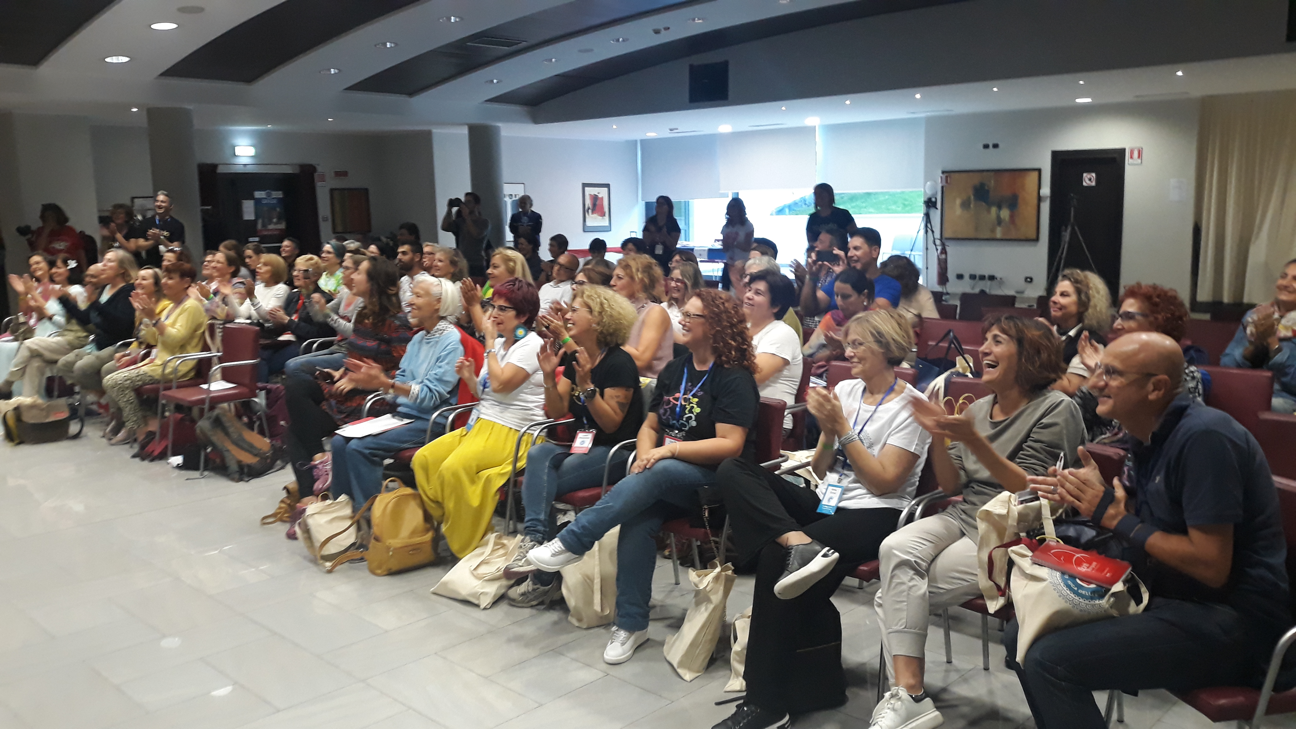 Ebbene sì: ridere è una cosa seria, e questo Convegno, organizzato dall’associazione YoRido, lo sta dimostrando nei fatti. Ieri sera sono partite le prime testimonianze di cambiamento concreto nella vita delle persone grazie a questa pratica; ce ne saranno oltre quaranta fino al 13 Ottobre. I partecipanti del Congresso hanno praticato diverse sessioni di Yoga della Risata insieme a Kataria, ballato la Laughter Dance con il romano Paolo Ricci, provato a suonare diversi tipi di percussioni con la Drum Circle di Stefano Ciceri. Dulcis in fundo è stata la lotta giocosa, con il Playfight ridente di Jessica Vanessi. Poi tutti a nanna, per ripartire stamattina con una lunga serie di incontri e attività.