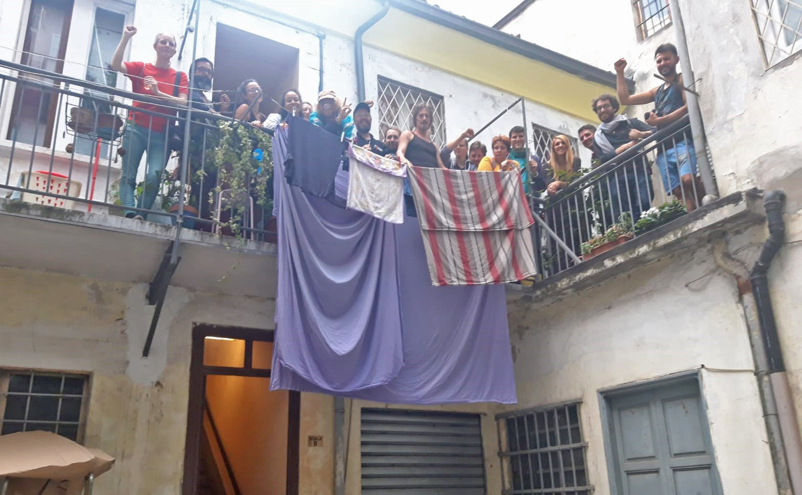 Infine un salto sul balcone più eclettico e folle di Torino, a conoscere Maksim e Daria, meglio noti per la loro iniziativa: “Concertino dal Balconcino”. Davanti a un bicchiere di vino pugliese – che per alcuni dei partecipanti sono diventati due, poi tre – la coppia di artisti e performer ci ha raccontato come un’iniziativa nata un po’ come un gioco, che consiste per l’appunto nell’organizzare concerti ed esibizioni dal vivo sul proprio balcone di casa, si sia trasformata in un evento di culto della scena musicale Torinese, capace di attirare migliaia di persone e in difesa della quale si è scomodato persino il Guardian. Alcune recenti vicissitudini legali hanno infatti rallentato – non di certo fermato! – la “rivoluzione artistica” portata avanti dai due, per via del presunto superamento dei decibel consentiti per legge. “Ma torneremo, meglio di prima, la rivoluzione non si ferma!” ci dice Maksim, prima che Daria ci saluti facendo risuonare l’intero cortile con un acuto cristallino.