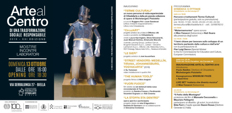 Dopo le attività del pomeriggio, alle 18.30 presso la Sede permanente del Terzo Paradiso in via Cernaia 46, è prevista l’inaugurazione ufficiale di Arte al Centro 2019 con gli interventi di Paolo Naldini e Michelangelo Pistoletto.