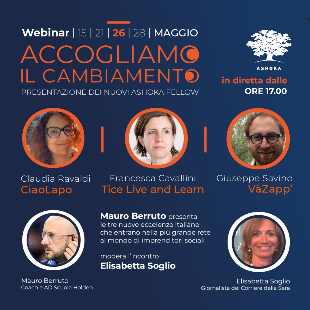 entrano nella più grande rete al mondo di imprenditori sociali. Le loro idee innovative, i nuovi approcci a problemi sociali che stanno già vedendo delle repliche a livello internazionale saranno presentati al pubblico durante un evento online il 26 Maggio 2020 in diretta sulla pagina Facebook di Ashoka Italia, con la presenza di Mauro Berruto, ex allenatore di pallavolo, AD della Scuola Holden di Torino ed esperto in coaching e formazione strategica per imprenditori e aziende e con la moderazione di Elisabetta Soglio, giornalista del Corriere della Sera.