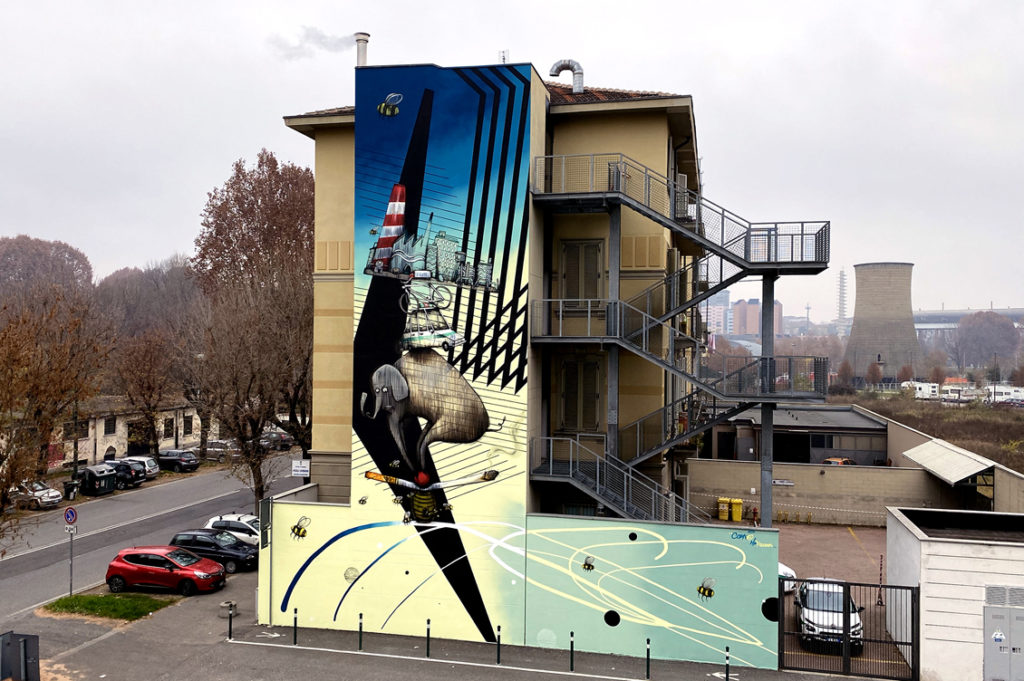 Oggi vi parliamo proprio dell’aspetto che lega arte, cultura e scienza attraverso la tematica ambientale. Qui gli artisti Corn79 e Mrfijodor hanno realizzato degli interventi di arte urbana sulle facciate dell’edificio e del frontespizio della palazzina del Comando Territoriale della Polizia Municipale di corso Umbria, creando una serie di rappresentazioni realizzate in due siti molto vicini che dialogano tra loro costituendo, di fatto, un unico progetto.