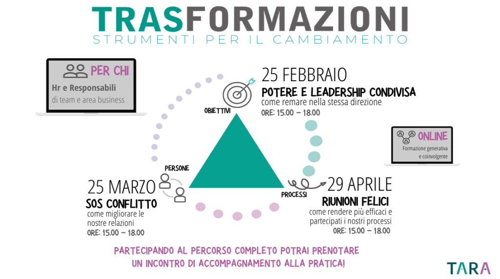 Ilaria Magagna, co-fondatrice di TARA Facilitazione, esplora il concetto di trasformazione applicato alle organizzazioni, siano esse aziende, associazioni o altri contesti in cui si lavora insieme. Proprio questo sarà infatti il tema del prossimo ciclo di incontri proposto da TARA.
