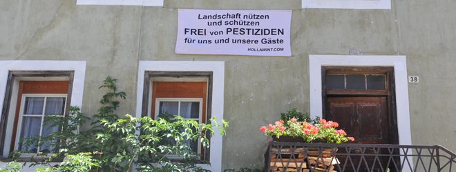Ci siamo incontrate tutte e ci siamo chiamate Hollawint. Volevamo che le nostre parole diventassero visibili. Ma non volevamo che fossero parole “contro”, che aggredissero, ma che spiegassero, che invitassero, parole che comunicassero la nostra idea di una Malles sana e sicura per tutti. Abbiamo stampato le nostre idee su pezzi di stoffa e vecchie lenzuola: “Un Comune libero da pesticidi”, “una casa sana per le persone, le piante e gli animali”, “un paesaggio senza pesticidi per noi e per i nostri ospiti”.