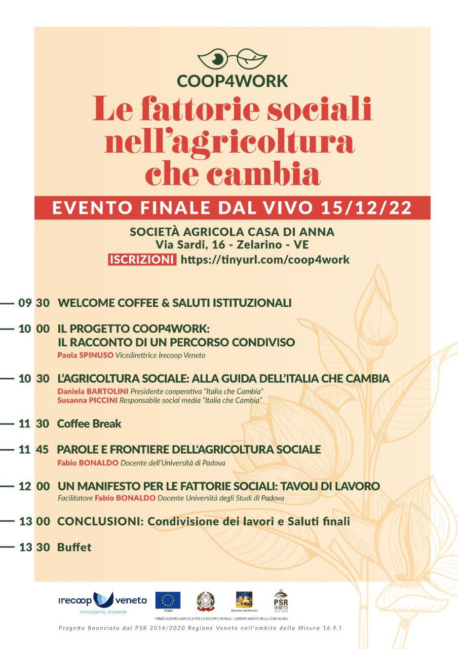 Sotto questo cappello si muovono non solo cooperative e imprese sociali, ma una molteplicità di forme organizzative che rende ancora più importante l’obiettivo che Coop4work si è data: creare nell’ambito sociale delle cooperative agricole sociali che si occupano dell’inserimento lavorativo in un modello in cui riconoscersi, facendo rete e confrontandosi nella diversità. Coop4work è un progetto nato nel 2019 in seno a Irecoop Veneto, riferimento regionale per formazione, consulenza e ricerca a sostegno della crescita e del cambiamento di persone, organizzazioni e reti attraverso la promozione di valori cooperativi, finanziato da PSR Veneto.