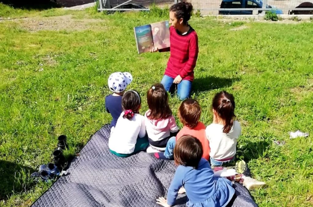 Parcheggiamo in uno spiazzo erboso a bordo strada e ci muoviamo a piedi verso l’asilo. Già da qui il panorama è molto diverso rispetto a pochi minuti prima. I bambini scendono dalla macchina e non stanno più nella pelle, corrono con i loro zainetti con pranzo e borraccia alla ricerca di questo pratone dove passeremo la giornata tra gioco libero, letture e attività creative.