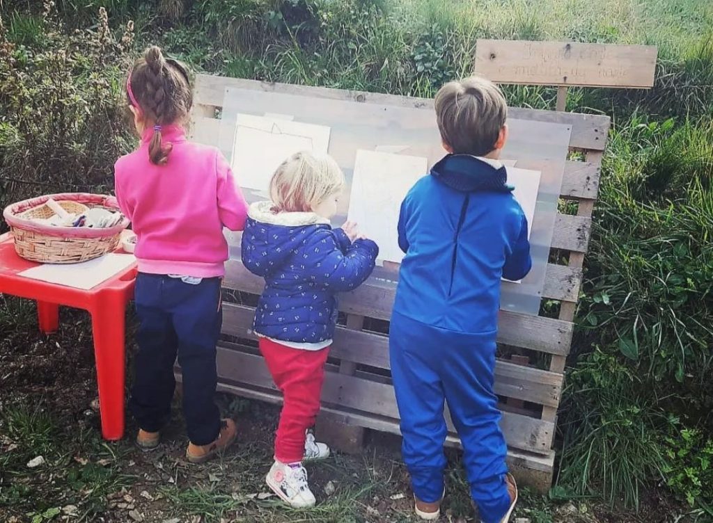 Dopo qualche minuto di salita e dopo aver attraversato un cancello lo troviamo: ci vengono incontro una dolcissima cagnolina, mascotte dell’asilo, Alessia e Giorgia, le educatrici. I bambini iniziano subito a giocare nella cucina in legno, esplorano lo spazio, entrano nella macchinina costruita con i pallet, saltano nei pneumatici colorati, si avvicinano all’atelier di pittura.