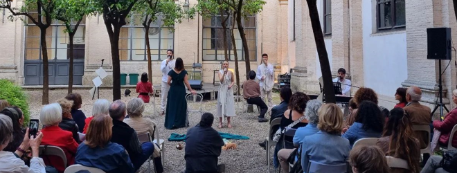 I nostri progetti base sono Fabrica musica letteratura in costruzione e Architetture e linguaggi, cioè passeggiate archeologiche che descrivono l’architettura dell’epoca romana, detta post-moderna. A questi due pilastri si sono poi aggiunte conferenze-concerto su temi che spaziano dalla storia dell’arte alla storia del costume, fino alla letteratura. Poi laboratori per bambini o per anziani sul mito e il cinema gratuito per soci e anziani. Infine un progetto la cui prima produzione è nata in pandemia: Forme, studio per una metamorfosi, la cui idea nasce dalla rielaborazione delle Metamorfosi di Ovidio, rappresentate in quattro stanze con testi anche originali e miti musicali, arrangiati per quattro voci e pianoforte.