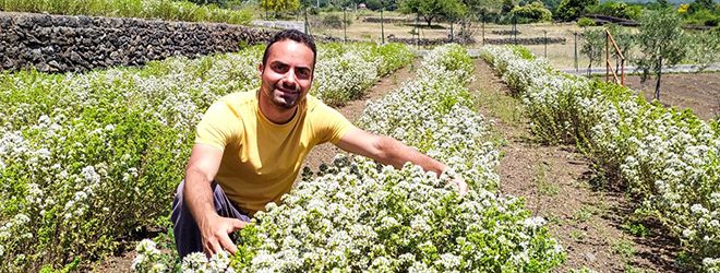 Nel cuore della Sicilia orientale, a Pedara, un paesino alle falde dell’Etna, Martino Allegra ha deciso di avviare la sua azienda agricola, Due Palmenti, in cui coltiva piante aromatiche. Questa è la storia di un ragazzo laureato che ha deciso di restare e cercare fortuna in Sicilia per esportare fuori dai suoi confini prodotti che, grazie alla qualità, esprimono la tradizione e i pregi del territorio.