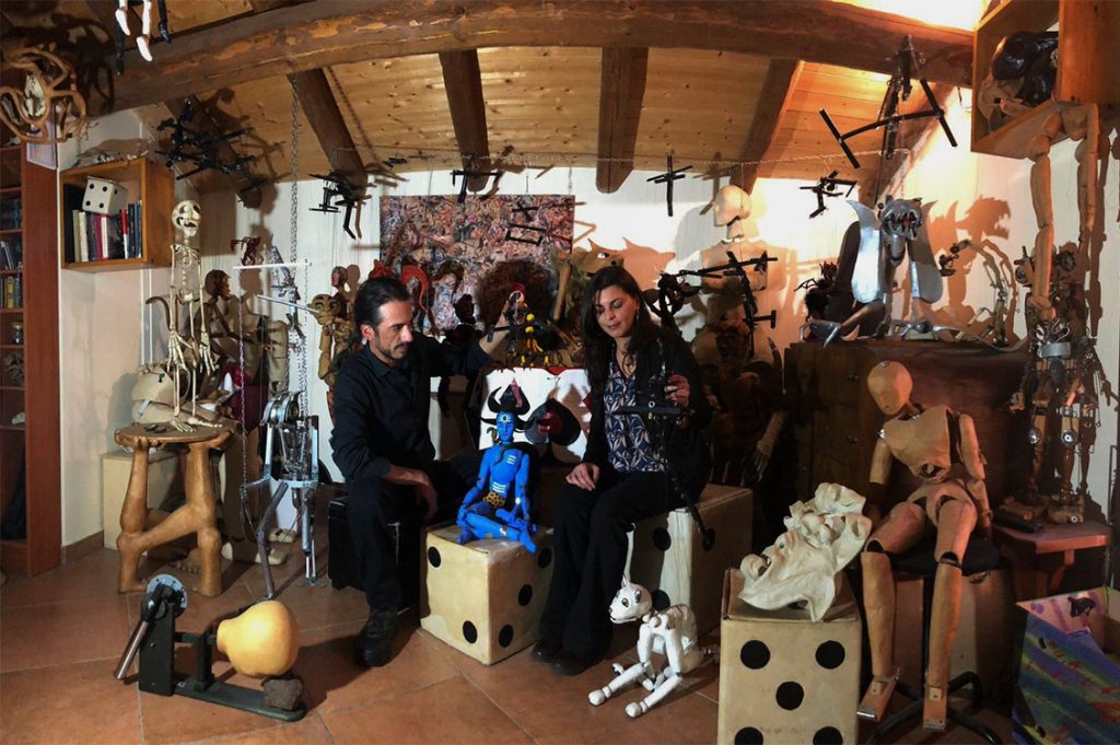 Ezio Scandurra e Tiziana Musmeci, coppia di artisti di Acireale, da qualche anno si sono trasferiti in campagna dove hanno realizzato il loro sogno di vivere immersi nella natura, circondati da animali e piante come fonte primaria di ispirazione per le loro creazioni. Nei loro laboratori prendono forma quadri, sculture e marionette spaventose e danzanti.