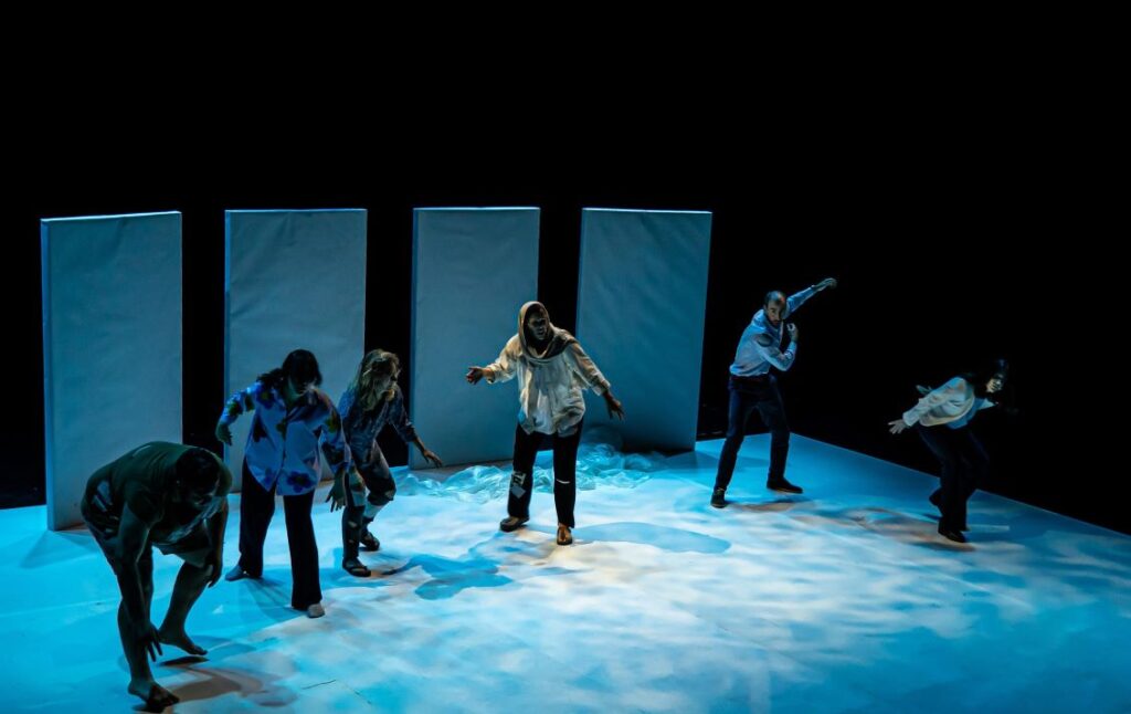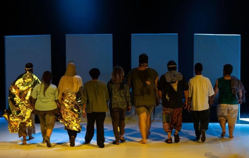 - La scenografia racconta il trauma delle migrazioni ambientali attraverso un’estetica povera e alienante.