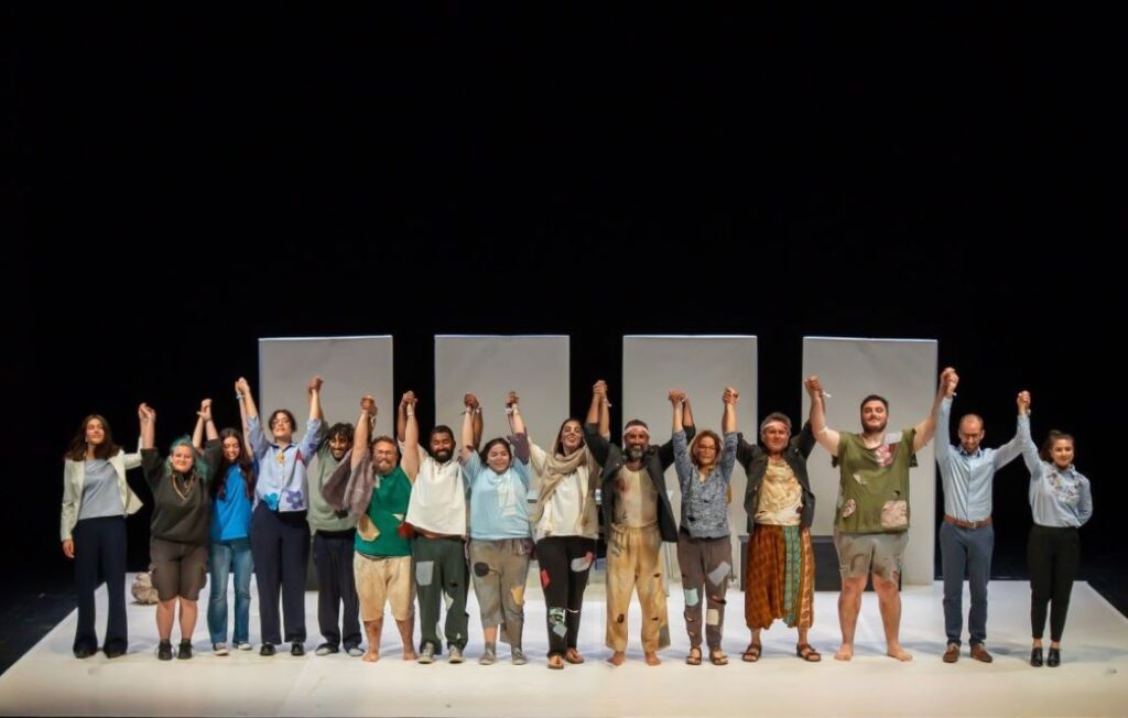 Il punto di partenza è stata la proposta ricevuta da Giovanni Di Stefano e Daniele Salvo, di Legambiente Giovani Energie, che mi hanno chiesto di riportare all’attenzione un tema già affrontato anni fa dal gruppo Terramare: quello delle isole sommerse. Abbiamo costruito una narrazione “agìta” sul palco, che si muovesse a partire da una vicenda immaginaria ma realistica: un gruppo di persone provenienti da isole non specificate approda in un altro Paese, dove vengono accolti.