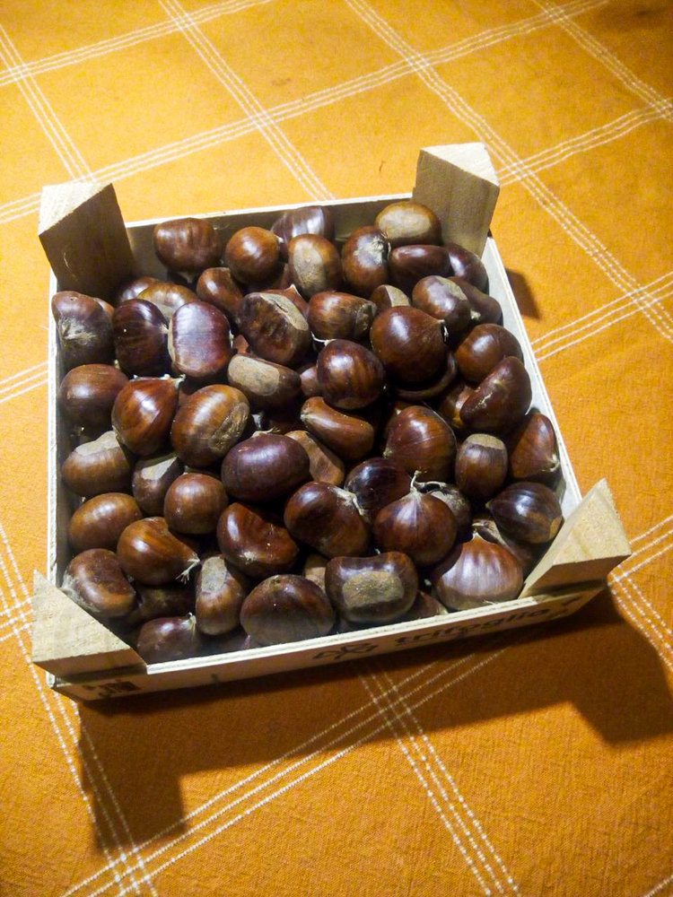 Un’amica ed io abbiamo un bosco nel cuneese, in autunno raccogliamo le castagne che gli alberi ci donano nel curarli in modo naturale (nessun trattamento, pulizia del bosco in estate e utilizzo degli elementi del sottobosco come concime).
