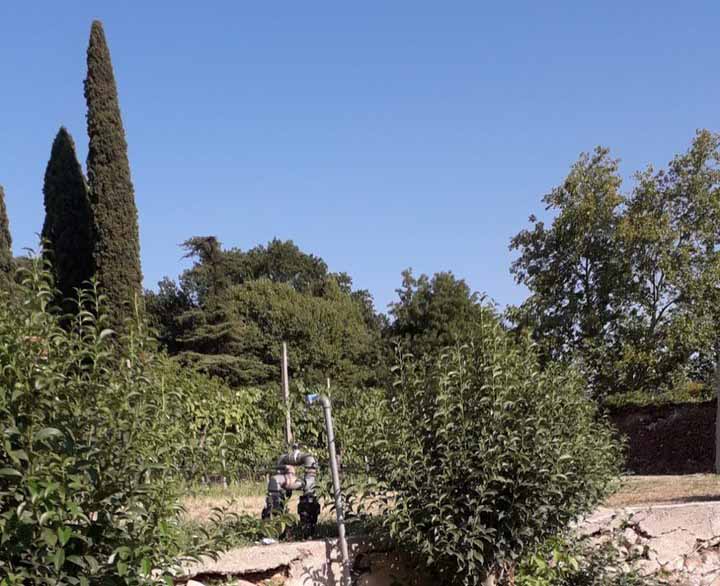 Il terreno è di circa due ettari complessivi, che comprendono un giardino con alberi secolari, una piccola vigna con frutteto e una ‘discesa’ selvatica. Esiste la possibilità di potenziare la coltivazione di ortaggi e frutti e di eventualmente tenere animali. La proprietà, pur essendo al centro del paese, è aperta verso la campagna.