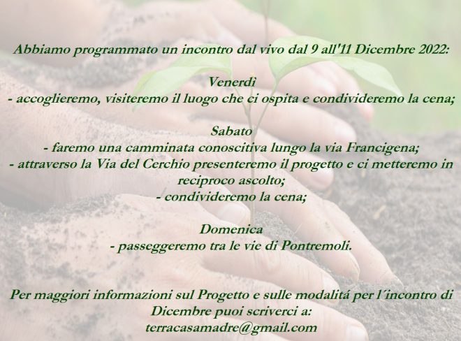 Vieni a conoscere dal vivo il progetto, in fase di avvio, Terra Casa Madre, dal 9 all’11 dicembre prossimo a Pontremoli: troverai, e farai parte, di un piccolo gruppo di persone che si sarà data il tempo e l’occasione per soggiornare insieme in un casale in campagna, presentarsi, conoscere il progetto e chi lo sta animando.