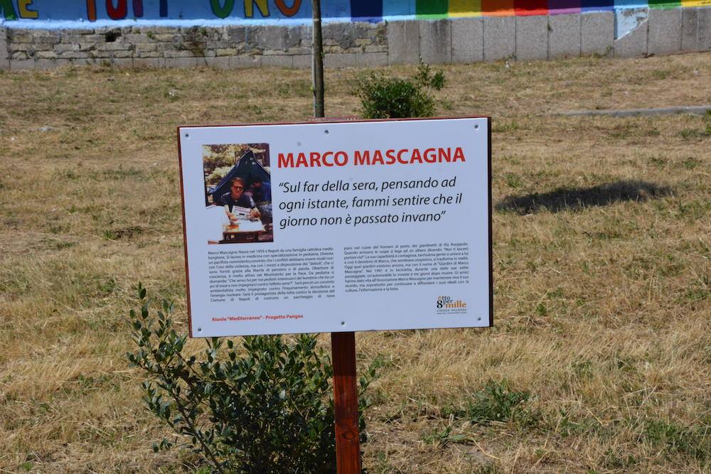 L’Associazione Giardino di Marco si occupa di combattere le disuguaglianze, difendere l’ambiente, contrastare la dispersione scolastica ed educare alla pace. Ha avuto inizio nel 1991, con l’idea di Marco Mascagna, pediatra ed ambientalista, che ha salvato i giardini di via Ruoppolo, a Napoli, dalla distruzione e trasformazione in parcheggio. Marco ha perso la vita in un incidente, ma le sue idee sono andate avanti attraverso l’associazione, che oggi compie attività di sostegno educativo ed economico, sensibilizzazione su temi ambientali, aggregazione giovanile e collaborazione con enti e realtà.