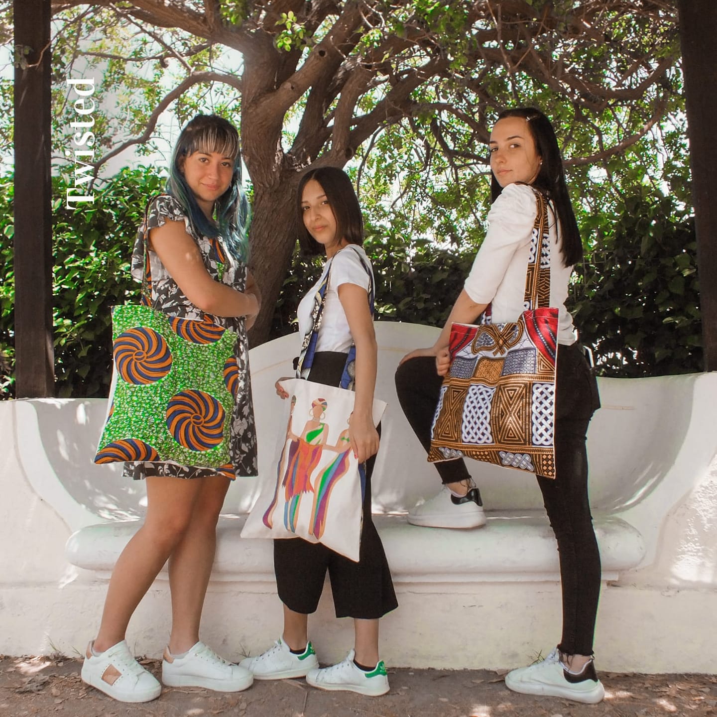 - Twisted > Twisted significa intreccio e vuole definire l’incontro di più talenti: l’illustrazione e il cucito. Nel periodo della pandemia che ha costretti alla distanza, queste borse sono state una visione sul futuro, il desiderio di portare avanti un progetto di integrazione, superando ogni restrizione. Distanti ma intrecciati, in una rete di solidarietà e creatività. Illustrazioni di Omar Samba e ideazione e creazione delle studentesse del settore moda dell’Istituto Professionale S.Pertini, classe 4°B TS